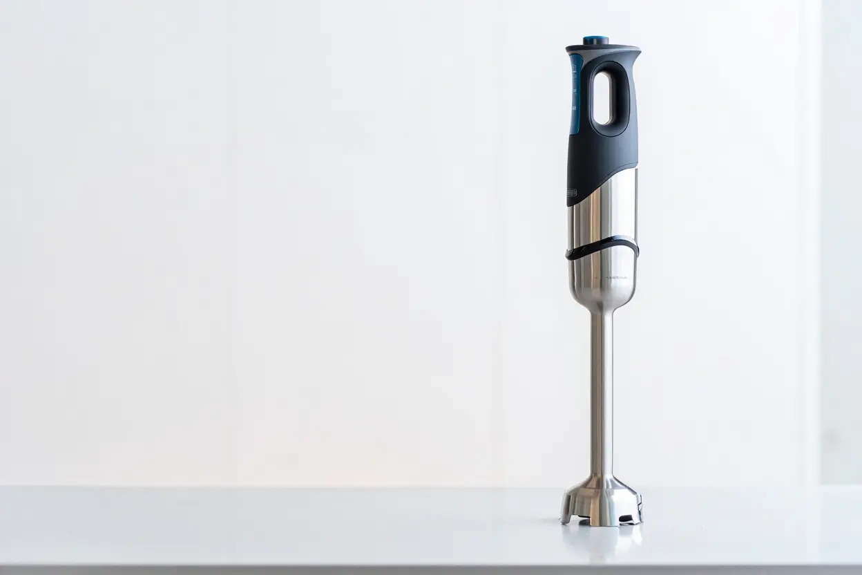 Multi-speed hand blender with whisk and chopper attachments.